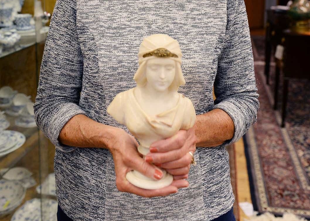 Del Rose identified the small marble sculpture as a bust of Beatrice, Dante’s would-be lover. Beatrice, aka Beatrice Portinari, plays a major role in the Italian poet Dante’s life and work, she said. According to brittanica.com, “Beatrice, the woman to whom the great Italian poet Dante dedicated most of his poetry and almost all of his life, from his first sight of her at the age of nine (“from that time forward, Love quite governed my soul”) through his glorification of her in la divina commedia, completed 40 years later.”