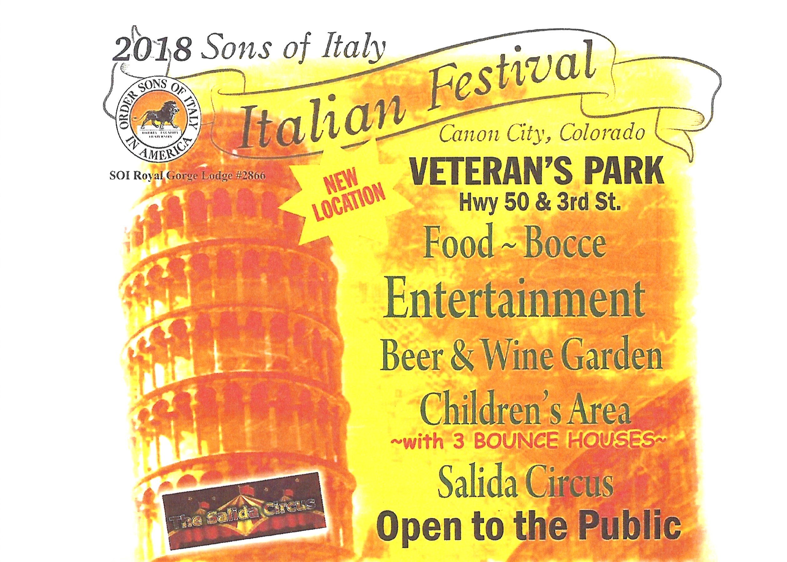 The Sons of Italy will host a Friday Night Festival Bash from 5 to 10:30 p.m. Friday at Veterans Park in Cañon City. Gates open at 4 p.m. There will be live music, and food, beer and wine will be available for purchase. Admission is $5. On Saturday, the event will run from 10 a.m. to 10 p.m. at Veterans Park. Admission is $2, children 6 and younger are admitted free of charge.