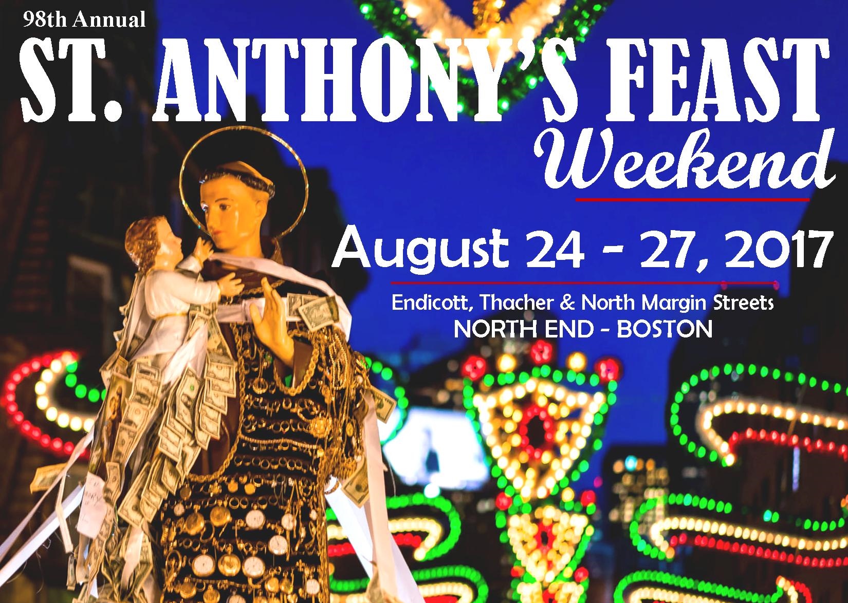 Saint Anthony’s Society is excited to announce the schedule of events for the 2017 Feast Weekend. The celebration will mark its 98th year on August 24 – August 27 on Endicott, Thacher and North Margin Streets in the North End. This year festivities begin Thursday evening with the Feast of Santa Lucia and will continue all weekend with the Feast of Saint Anthony on Friday, Saturday & Sunday!