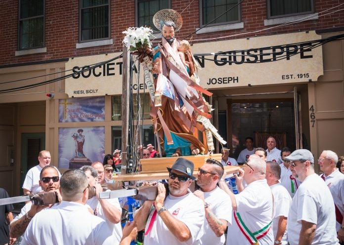 Societa San Giuseppe di Riesi held their annual procession to honor the popular Saint Joseph on Sunday afternoon. Carrying the St. Joseph statue through the streets of Boston’s North End, the group was accompanied by the the North End Marching Band and the Northeast Italian-American Band.