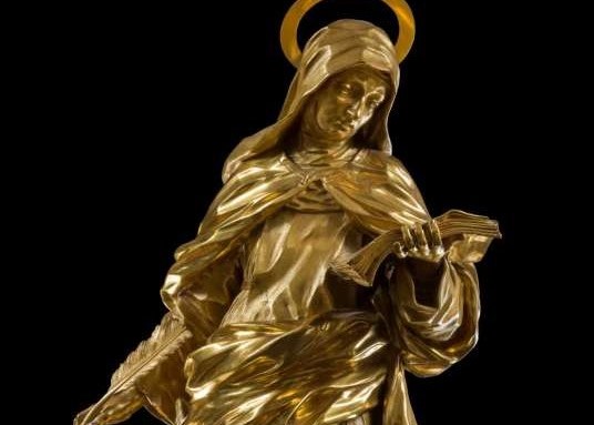 She shimmers and shines — her simple brown robe and cream cape transformed into lustrous waves of gold. She holds a quill pen in her right hand and cradles a book of her spiritual writings in her left. On this morning, Linda Wolk-Simon is standing before her.