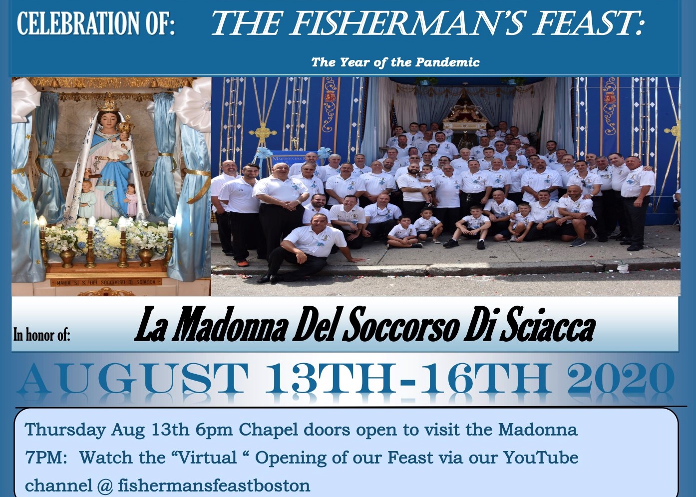 The Fisherman’s Feast would have taken place this weekend, August 13-16, 2020, in the streets of the North End. As with all of the feasts, the COVID-19 pandemic has canceled the 110th annual street festival. La Madonna del Soccorso di Sciacca Society has arranged for commemoration in Boston’s North End, including several virtual events.
