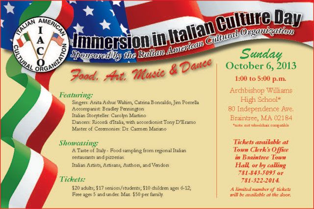 Sponsored by the Italian American Cultural Organization of Braintree, the Immersion in Italian Culture Day will celebrate food, art, music and dance... all from Italy!