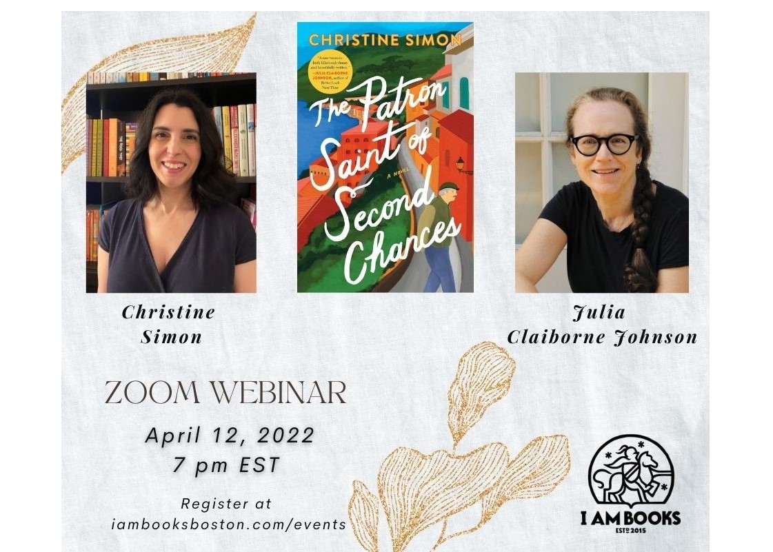 Tuesday April 12, 2022 — 7 p.m. EST. Zoom Webinar (Register Here). Organized by I AM Books. Join us in conversation with Christin Simon and Julia Clairborne Johnson. Christine Simon grew up in a very large and very loud Italian family and now lives with her husband and four children in New Jersey. The Patron Saint of Second Chances is her first novel.