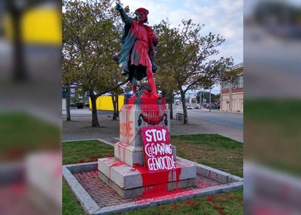 The statue was splashed with red paint Oct. 14, when the U.S. holiday named for one of the first Europeans to reach the Americas was being celebrated. A sign that said “stop celebrating genocide” was leaned against the pedestal. It was one of several Columbus statues vandalized nationwide.