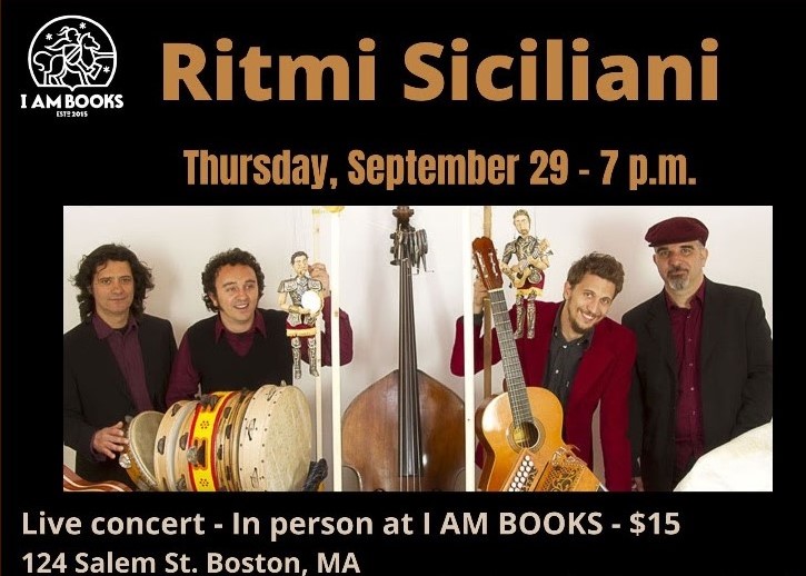 Thursday, September 29, 2022. 7:00 PM – 8:00 PM EDT. I AM Books - 124 Salem Street - Boston, MA 02113. This is a ticketed event with limited seating. Please purchase your tickets here. Join I AM Books for an evening of traditional and modern Sicilian music with I Beddi! "Di folk in folk" is a performance with sounds, songs, lyrics and tales belonging to Sicily.