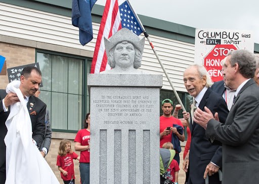 The Christopher Columbus bust in front of the North Main Street municipal center will remain following party-line Town Council votes Monday night. The six council Republicans defeated motions supported by the three Democrats to take down the statue, as well as a proposal to form a committee to determine its future.