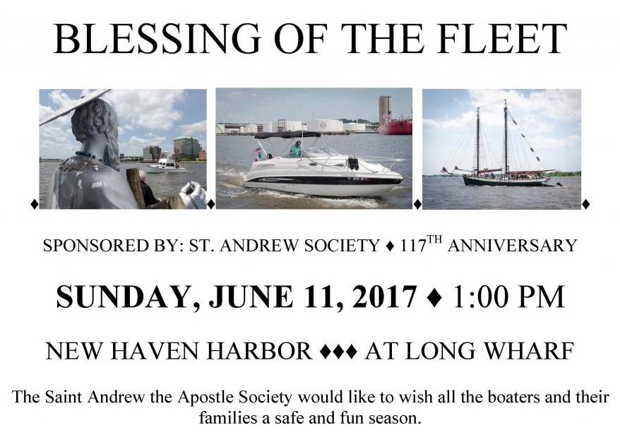 The St. Andrew Society will hold its annual “Blessing of the Fleet” Sunday (June 11, 2017) at 1 p.m. in New Haven Harbor. Boats will line up at 12:30 p.m. off Dock AA of the Bruce and Johnson Marina in Branford and then proceed to New Haven for the ceremony.