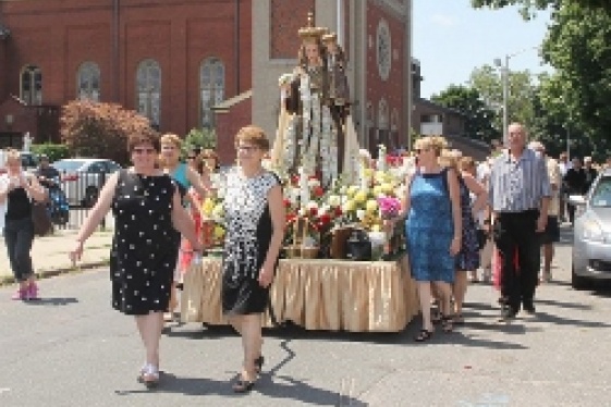 In anticipation of the Feast of Our Lady of Mount Carmel in mid-July, members of the Our Lady of Mount Carmel Society carried a statue of the Blessed Mother through the streets of the South End to their headquarters, where they provided a free brunch and music for the community. As it was carried outside the church, the procession paused s...