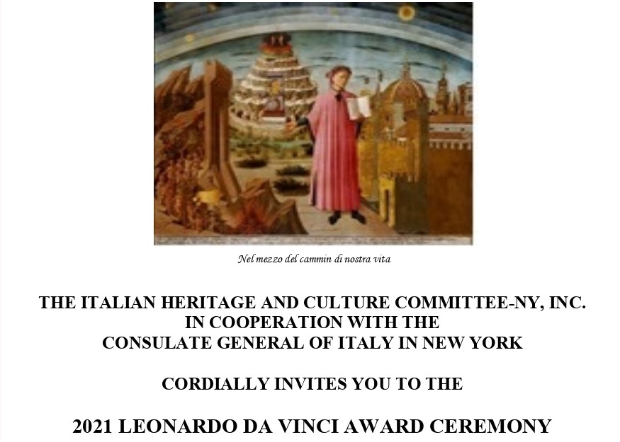 The Italian Heritage and Culture Committee-NY, inc. in cooperation with the Consulate General of Italy in New York cordially invites you to the 2021 Leonardo da Vinci Award Ceremony presented to Prof. Luigi Ballerini - award winning poet, essayist, translator, and curator. Friday, October 8, 2021, 6:00 pm. Reception to follow. Consulate General of Italy in NY - 690 Park Avenue, New York, NY 10065. Guests must present proof of ID and proof of vaccination