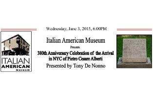 The Italian American Museum in association with The Italian Historical Society of America proudly invites you to celebrate the 380th Anniversary of the First Italian Settler Pietro Cesare Alberti who arrived in New York City on June 2, 1635. A Talk and Film Presentation by Award-winning TV Producer-Writer-Director, Historian and Speaker in the Humanities Tony De Nonno