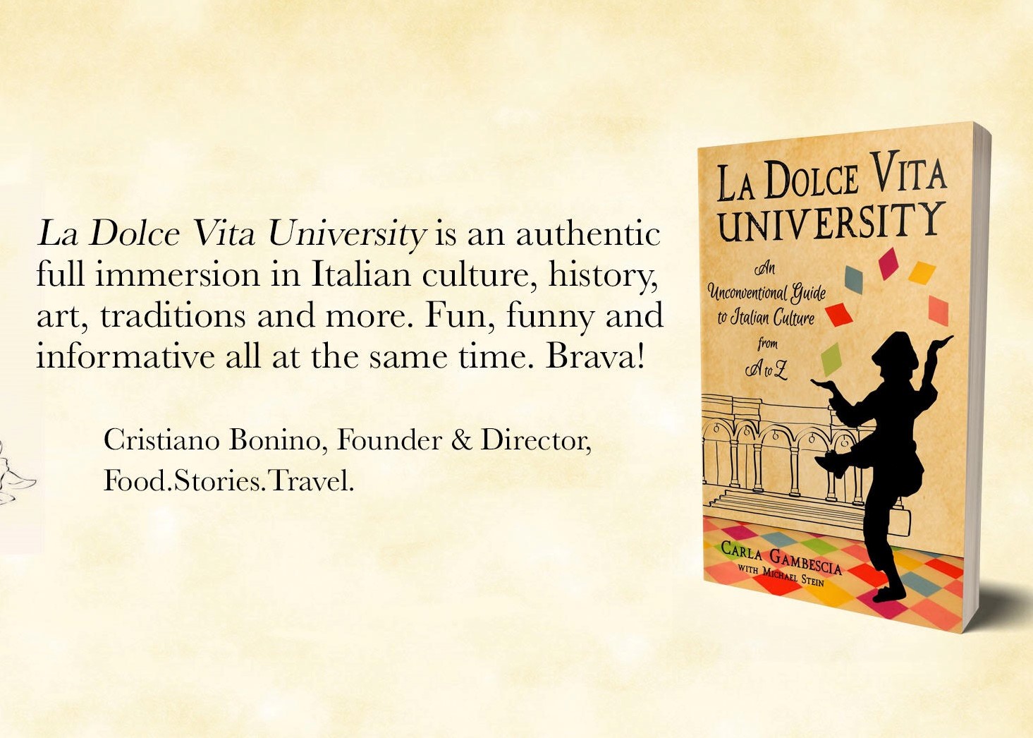Carla Gambescia, New York area author of La Dolce Vita University: An Unconventional Guide to Italian Culture from A-Z; a unique lifestyle compendium of all things Italian: food, wine, history, architecture, art, style, anecdotes, attitude, will be the guide as she explores the special alchemy of Italy and the cultural DNA, that has made it not only so influential but also so beloved. Even the most sophisticated Italophile will discover fascinating new facts and insights.