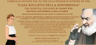 Holy Mass takes place at 7pm on September 16, 2013 at The Sacred Hearts & Stephen Church: 108 Carrol St., Brooklyn, New York 11231. The Gala Dinner takes place at 9:30pm on September 16, 2013 at Marco Polo Ristorante: 345 Court Street, Brooklyn, New York 11231. Tickets are available at $200.00 per person and sponsorship opportunities are available. http://igg.me/at/padrepioevents/x/2604766