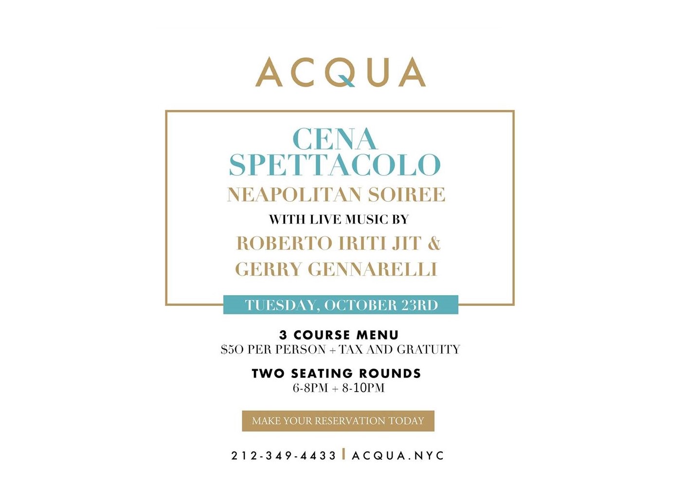 Dear friends, we are excited to invite you all to our Cena Spettacolo - Neapolitan Soiree on Tuesday, October 23rd! The night will feature a special Neapolitan menu created just for this night by our very own Chef Giuseppe Marrone, paired with some great live music by Neapolitan sensation Gerry Gennarelliand Roberto Iriti Jit.