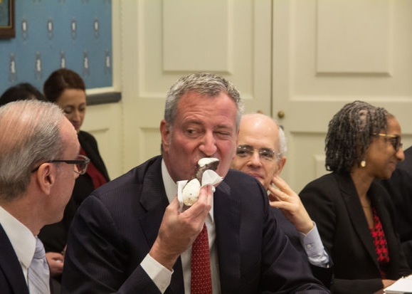 Leave the knife and fork, take the cannoli. Mayor Bill de Blasio chowed down on some cannoli with his paisans on Staten Island to kick off his weeklong work stint in the borough. The pastries, from Royal Crown Bakery in Grasmere, were gifted to the mayor from Borough President James Oddo to welcome de Blasio to Borough Hall the only way Italians know how, with food.