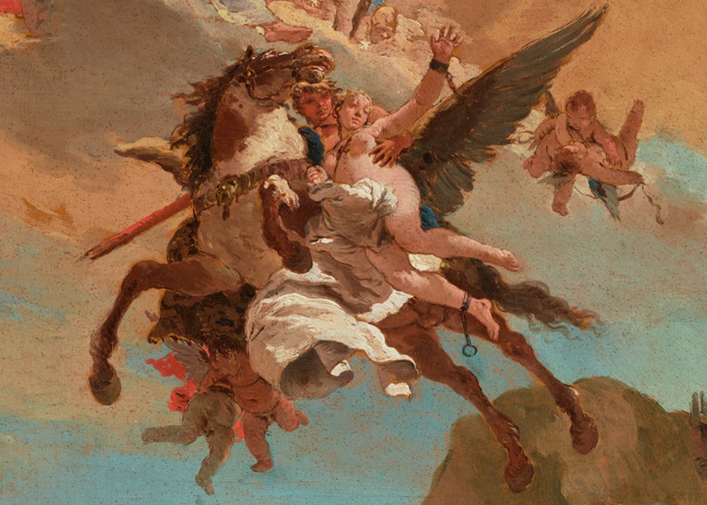 The lovers are soaring through gold. In Giambattista Tiepolo’s fresco “Perseus and Andromeda,” which was painted around 1730-31 and luxuriated across the ceiling of a Milanese palazzo, a winged horse spirits away the boyish Perseus, a heroic son of Jupiter with a mop of golden hair, who has just driven his lance into a ravenous sea monster.
