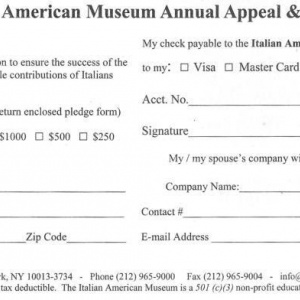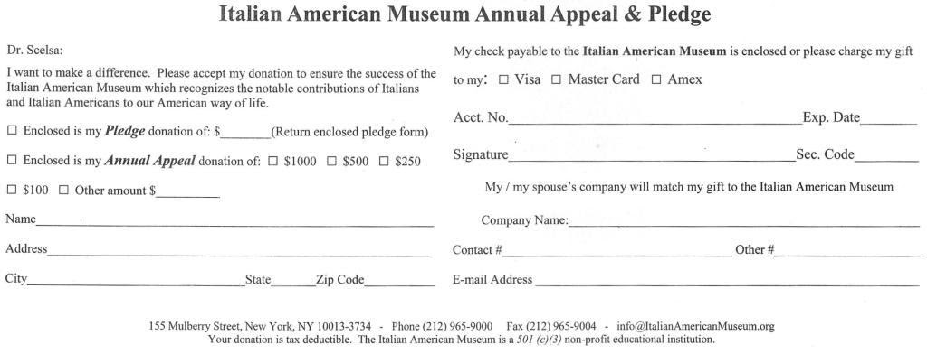 To make your donation or pledge, please print the form below and mail completed form along with your donation or pledge to Italian American Museum, 155 Mulberry Street, NY, NY 10013, Email to ItalianAmericanMuseum@gmail.com or Fax to 347.810.1028.