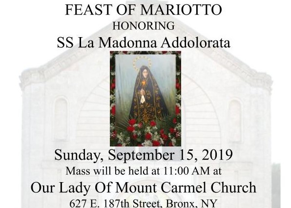 The descents of a small town named Mariotto in the province of Bitonto (Bari) italy and devotees of La Madonna Addolorata continue the cultural tradition of commemorating their heritage every September. Of course, no celebration would be the same without having friends, family and neighbors join in on the fun. Join the festivities on September 15, 2019 at 11 AM in honor of Maria SS. Addolorata (Sorrowful Mary) at Our Lady of Mount Carmel Church in the Belmont section of the Bronx.