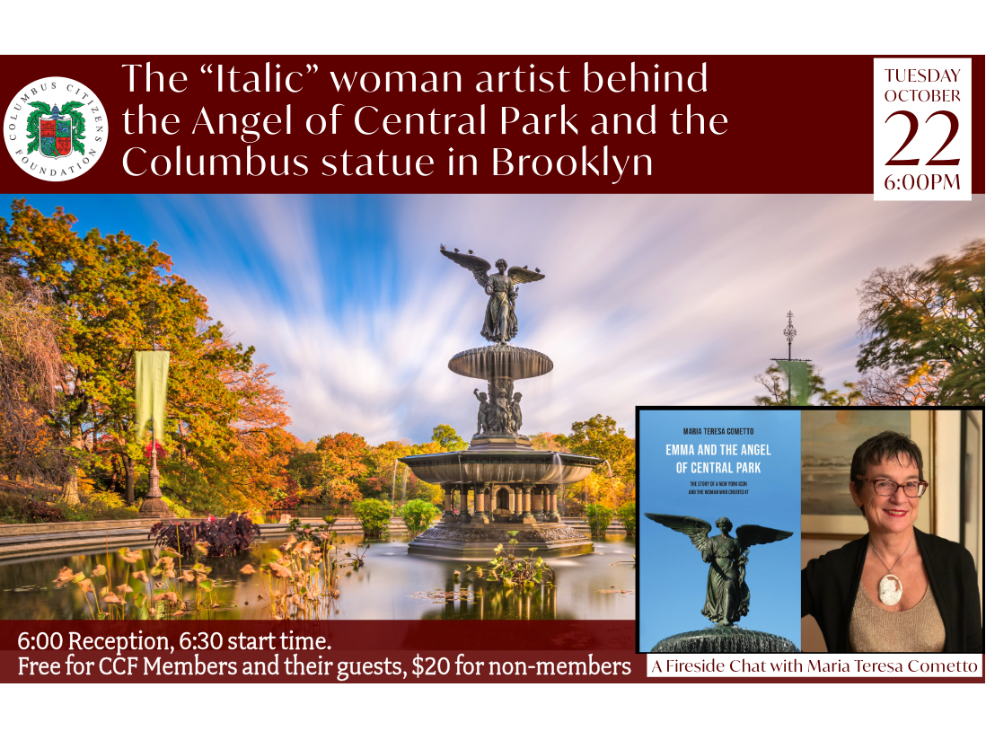 Tuesday Octber 22 at 6PM. Columbus Citizens Foundation 8 East 69th Street, NYC. Very few people know that two important monuments in New York City were created in Rome by New Yorker Emma Stebbins, the 19th century designer of Angel of the Waters at Bethesda Foundation in Central Park and Christopher Columbus, the statue adjacent to the New York State Supreme Court in Brooklyn.
