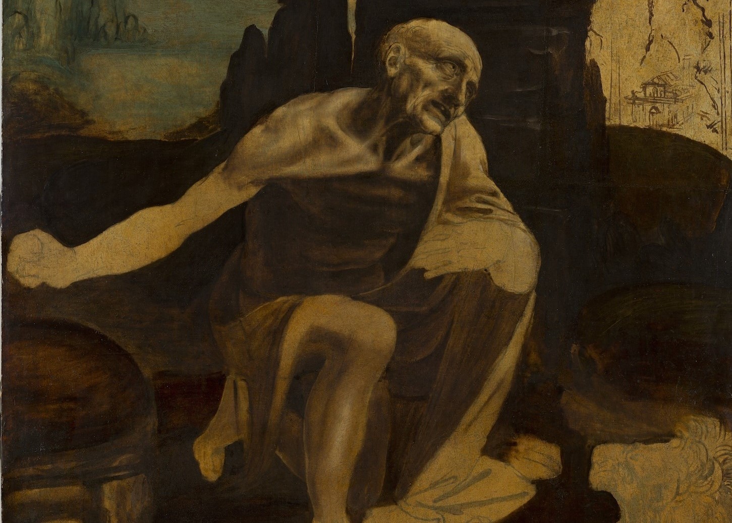 The work portrays St Jerome (A.D. 347–420), one of the key theologians of the early Christian Church, during a two-year period when he lived as a hermit in a desert in Syria. Leonardo has him seated, holding a rock in one hand, which he used to beat his chest in penance, according to lore. Likewise, tradition holds that the lion curled in front of Jerome became his companion after the Saint extracted a thorn from the animal’s paw.