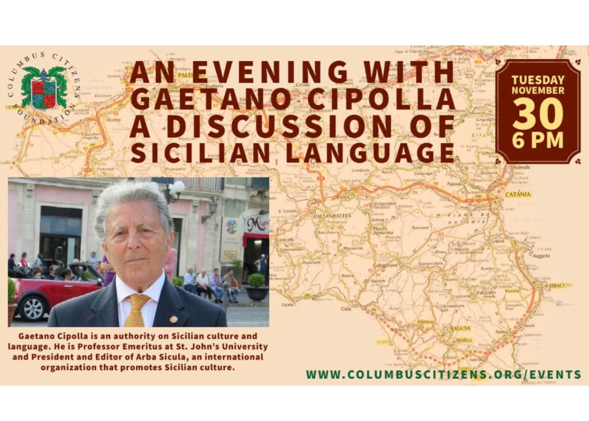 Join us on November 30 at 6pm for an enlightening evening with Gaetano Cipolla, an authority on Sicilian culture and language. RSVP Here. He is Professor Emeritus at St. John’s University and President and Editor of Arba Sicula, an international organization that promotes Sicilian culture.