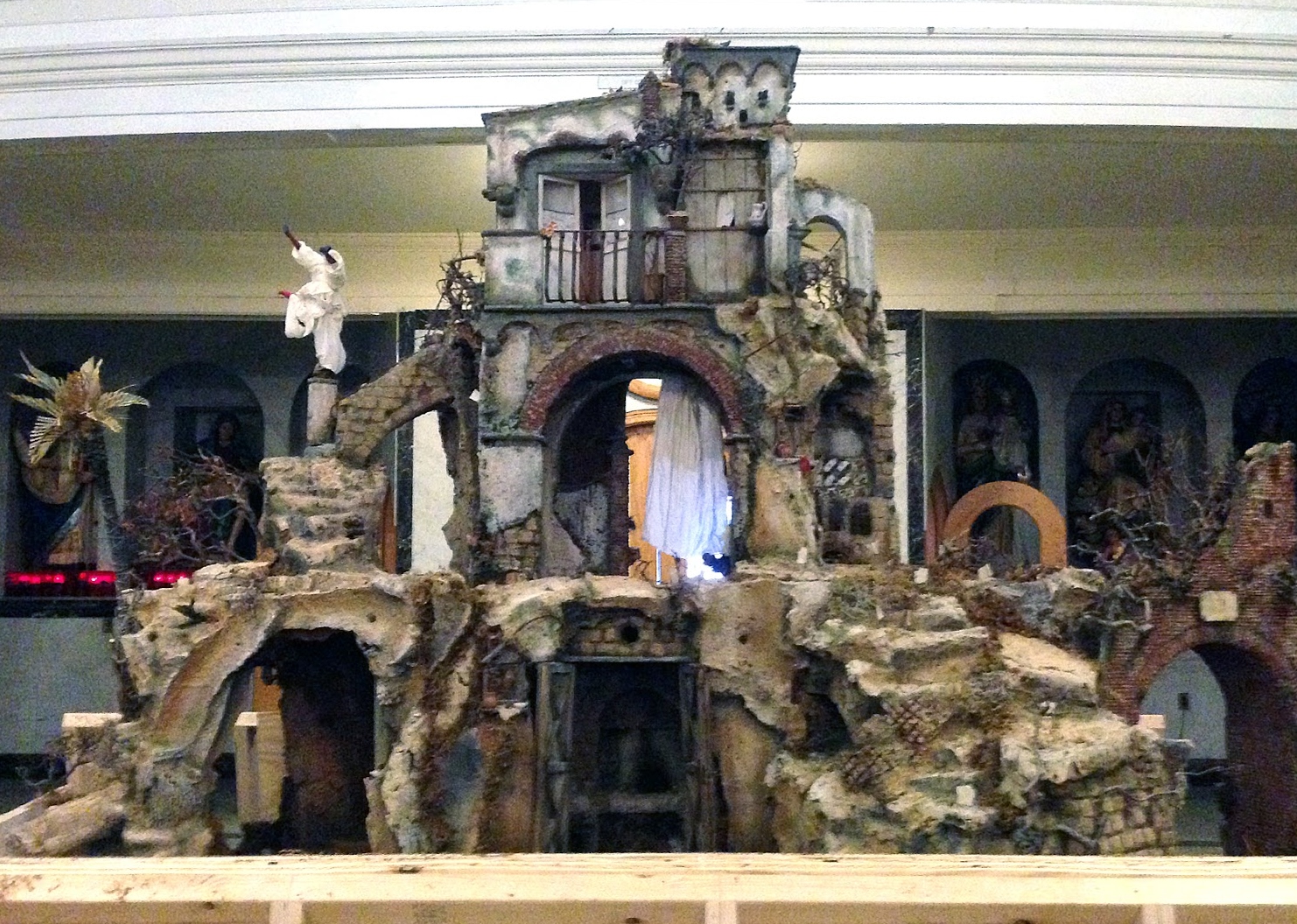 Arriving early, I entered the church for a Holy Hour of Prayer and found the Neapolitan presepiodisassembled in the nave. A lone Pulcinella was all that remained on the desolate scenery.