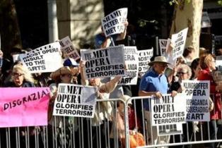 About 400 people stood behind police barricades chanting "Shame on the Met!" and carrying signs saying "The Met glorifies terrorism" before the company's first performance of "The Death of Klinghoffer."