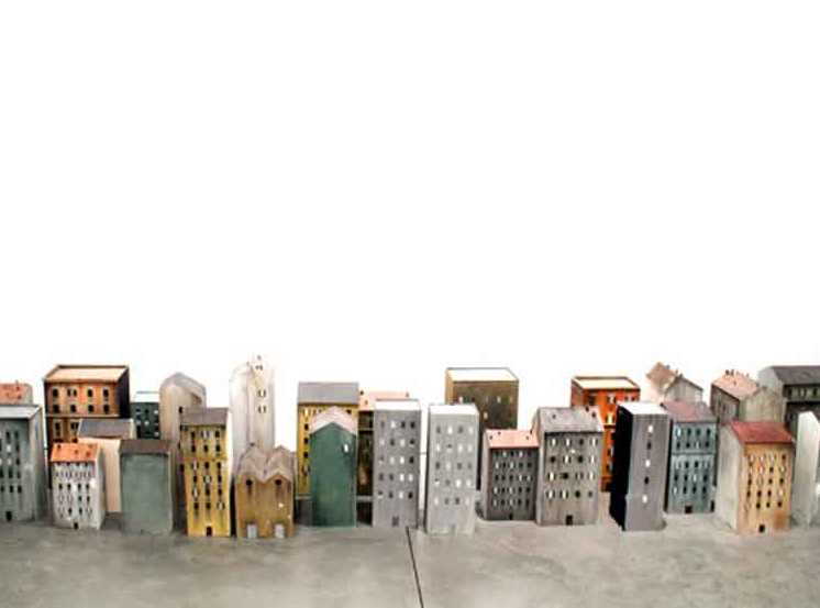 Paolo Ventura's Infinite City, is composed of sets of unique hand painted, 4" x 5" photographs. The works are groups of either 5 or 10 images, all framed individually, hung together to create a skyline of an imagined city. Inspiration for the infinite skyline came from trips the artist took on the "Q" train, from Brooklyn to Manhattan and Italian writer, Italo Calvino's book, Invisible Cities. In a conversation between two characters, Calvino's book explores imagination and what is possible through the descriptions of cities. The book consists of brief prose poems describing 55 cities, where there are short dialogues between the two characters, interspersed every five to ten cities. The book is structured around an interlocking pattern of numbered sections, where the length of each section's title graphically outlines a continuously oscillating city skyline.