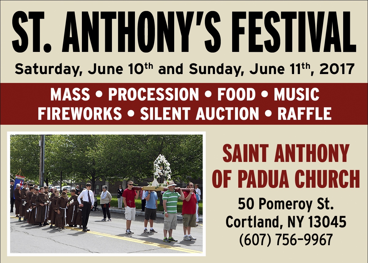 The St. Anthony’s Festival is this weekend at the Church on Pomeroy Street in Cortland. On Saturday, a spaghetti dinner, then mass in Italian, followed by music and fireworks.