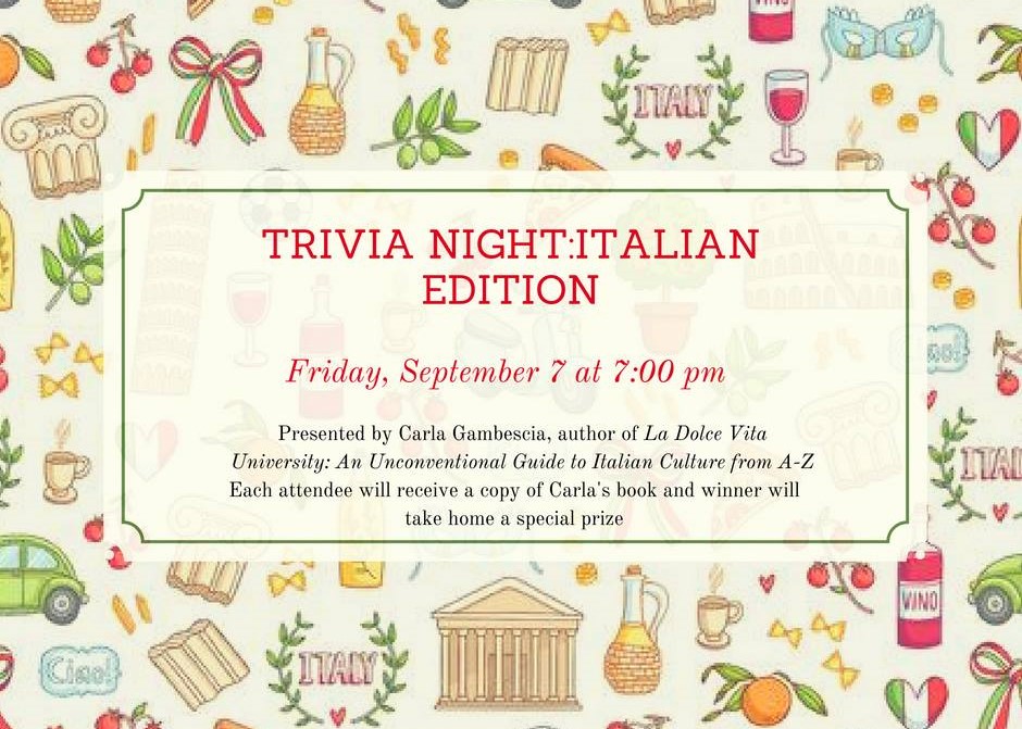 Trivia Night: Italian Edition! September 7 (Friday) 7:00 pm - Westchester Italian Cultural Center. One Generoso Pope Place, Tuckahoe, NY. Admission: Members $30; Non-Members $35. Contact: Lindsay Brewster 914-771-8700 lbrewster@wiccny.org
