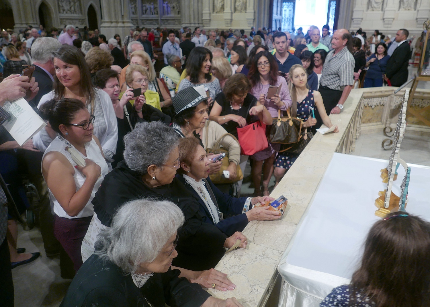 Cardinal Dolan celebrated Mass officially welcoming the relics at 10:15 a.m. Sunday at the cathedral. The Sistine Chapel Choir provided resplendent music throughout the liturgy. After the Mass, the line for the relics extended to the front steps of the cathedral’s Parish House, at 51st Street and Madison Avenue. The cathedral is located at Fifth Avenue and 50th Street.