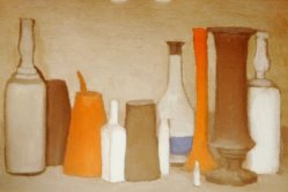 by Roberta Smith In memory, the still lifes of the Italian painter Giorgio Morandi (1890-1964) can sometimes seem like the medium's best comfort food — familiar, satisfying and a little monotonous. His repeating images of humble domestic objects — bottles, long-necked vases and little cookie tins set against expanses of empty wall and tabletop — c...