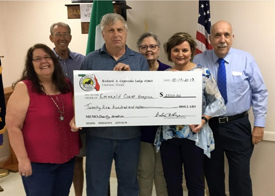 The Richard A. Capozzola Lodge No. 2865 Crestview President Bob Grappone recently presented a check to Kim Bowman representing Emerald Coast Hospice. Also present are Ginger Grappone, Ron Milburne, Martha Hughes and Immediate Past President Tom Hughes.