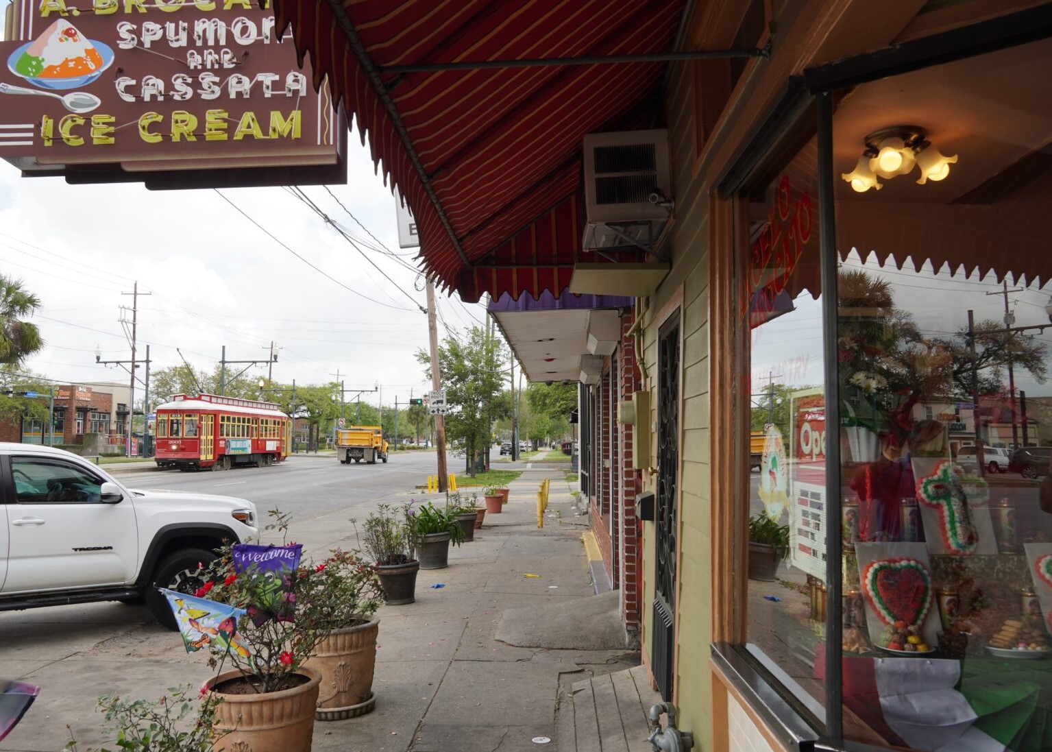 Arthur made a decision to move the altar from the back of the gelato parlor to the front window of the store. A customer places and order at the front of Brocato’s Italian Pastry store. The St. Joseph’s Altar is to the right.