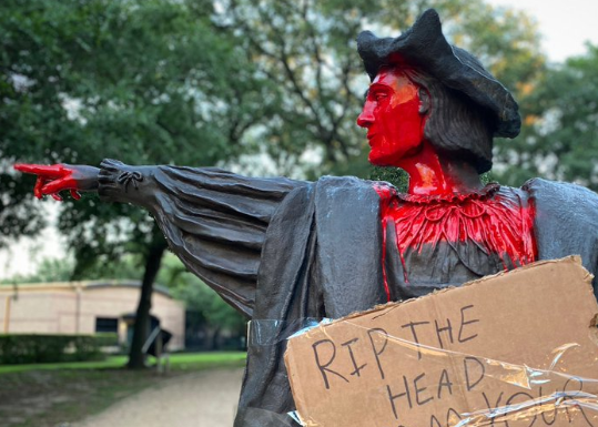 The Christopher Columbus statue at a park near the Museum District has been vandalized again. As in previous incidents, vandals tossed what appears to be red paint on the 7-foot-tall statue, which is located at Houston's Bell Park at 4900 Montrose. The statue also bears a cardboard sign with the message, "Rip the head from your oppressor."