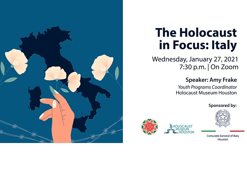 To remember the victims of the Holocaust, on Wednesday, January 27, 2021 the ICCC in collaboration with the Holocaust Museum Houston and sponsored by the Consulate General of Italy in Houston will present an online lecture on the Italian Jewish community before the Holocaust, the Nazi rise to power, the implementation of Anti-Jewish laws, deportations from Italy, concentration camps, rescuers, resistance, and liberation.