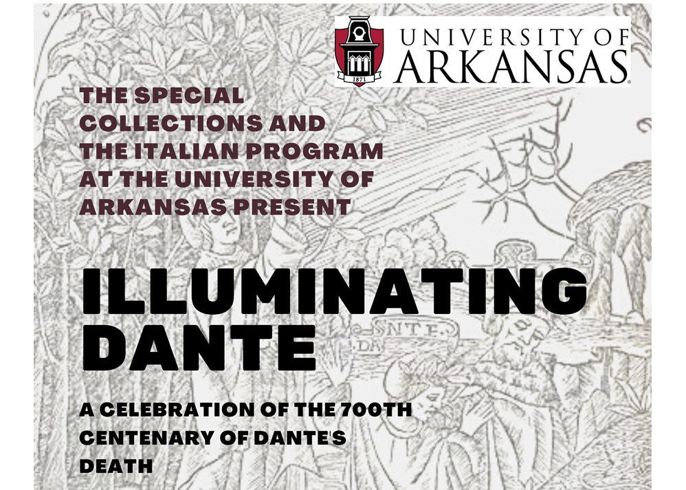 "Illuminating Dante," an exhibit celebrating both the seventh centenary of Dante's death (1265-1321) and Italian American Heritage and Culture month in October, is presented by Special Collections and the Italian Program in the World Languages, Literatures, and Cultures Department at the U of A. Running from Oct. 5-31, the exhibit consists of 22 items organized in two cases and in expository columns on the first floor of Mullins Library.