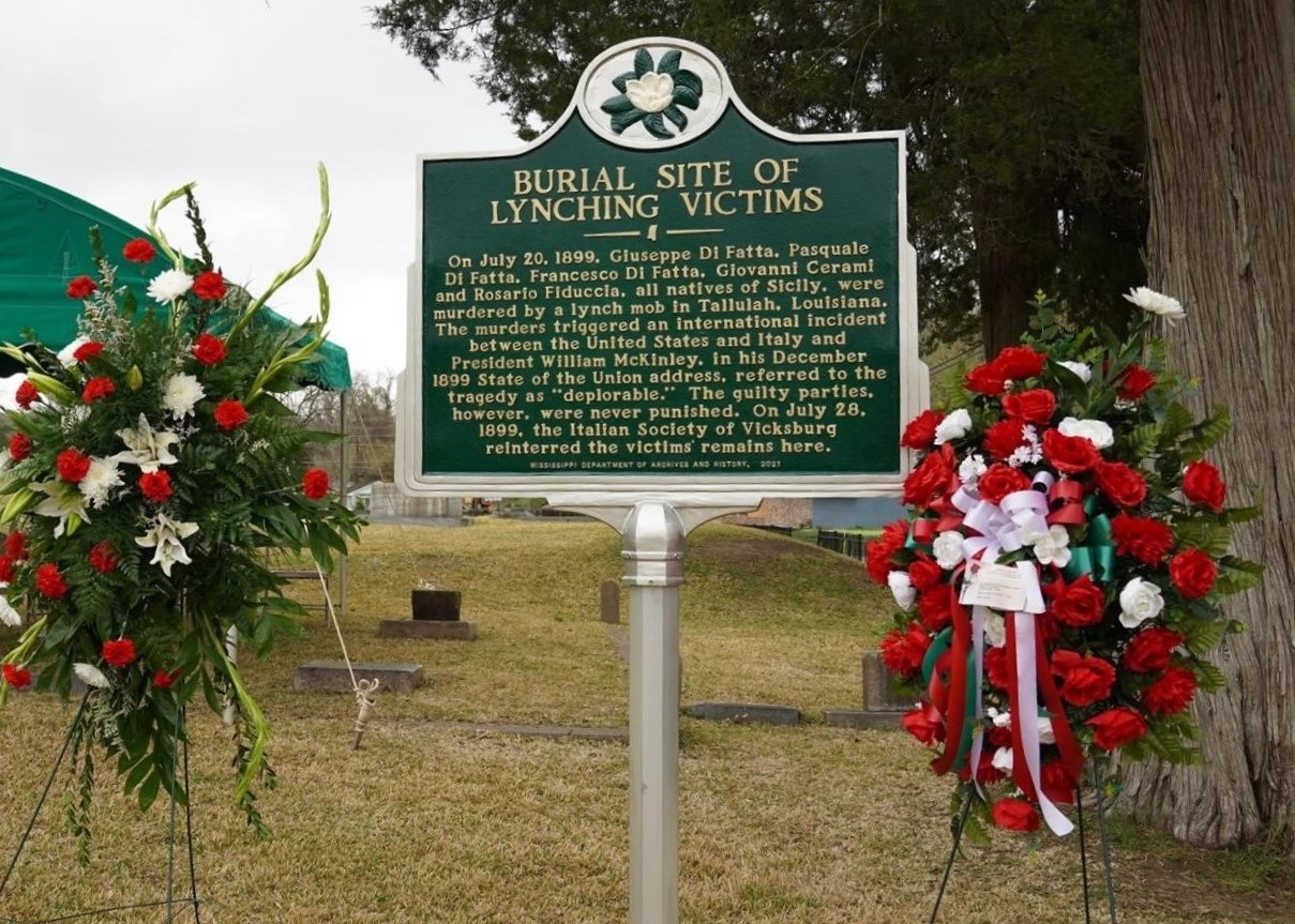 The State of Mississippi and City of Vicksburg honored five Italians who were lynched just across the Mississippi River in Tallulah, La., on July 20, 1899. Five Italian men who owned grocery stores in town, were seized by a mob of local residents and publicly hanged. The men honored are Giuseppe Di Fatta, Francesco Di Fatta, Pasquale Di Fatta, Giovanni Cerami and Rosario Fiduccia. Three of the men were brothers and all were related.