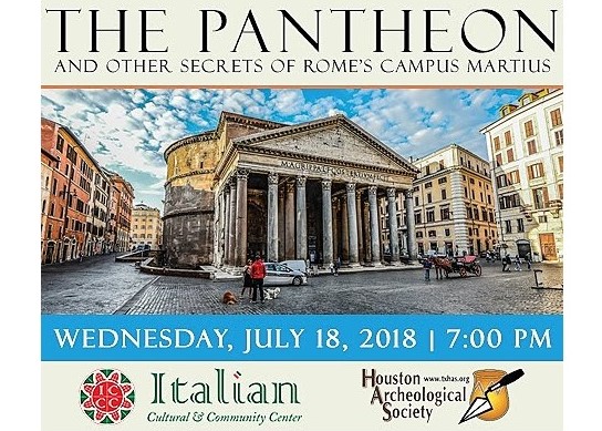 Wednesday, July 18, 2018 at 7:00 pm. Italian Cultural & Community Center - 1101 Milford St - Houston, TX 77006. Doors open at 6:45 pm. $10 ICCC Members | $15 Non-members. Get tickets and information here. Presented by Louis F. Aulbach and Linda C. Gorski of the Houston Archaeological Society. Join us as we reveal the ruins of the structures of the Campus Martius, and as we address some of the mysteries of the Pantheon itself, not the least of which is the answer to the question: Who built the Pantheon?