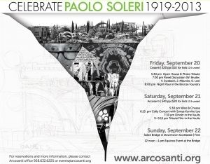 You are invited to join us in celebrating the life of Paolo Soleri. We set aside 3 days (Friday, Saturday and Sunday) around Fall Equinox for this celebration. There will be "An Evening at Cosanti" in Paradise Valley on Friday, "A Day at Arcosanti" on Saturday and "High Noon at the Soleri Bridge" in Downtown Scottsdale on Sunday.