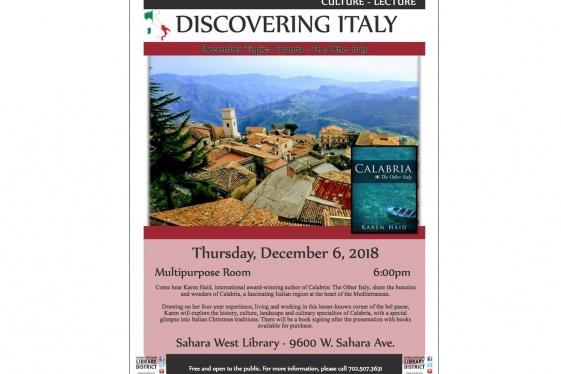When: Thursday, December 6th (6:00pm–7:30pm) - Where: Sahara West Library, 9600 W Sahara Avenue, Las Vegas, Nevada 89117 - Free and open to the public. For more information, please call 702.507.3631. Come hear Karen Haid, international award-winning author of Calabria: The Other Italy, share the beauties and wonders of Calabria, a fascinating Itali...