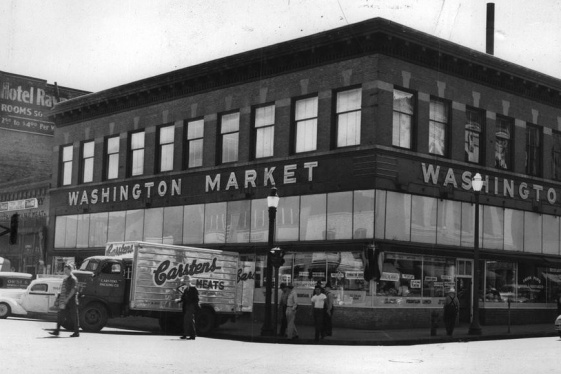 The Washington Market, built in 1911, was a clothing store before turning over to groceries around 1914. Typical of the era, space was leased to a mix of independent dealers selling meat, produce, dairy and other specialties, such as tea and coffee, or candy. Awnings were extended over outdoor stalls of fruits and vegetables on the sidewalks when t...
