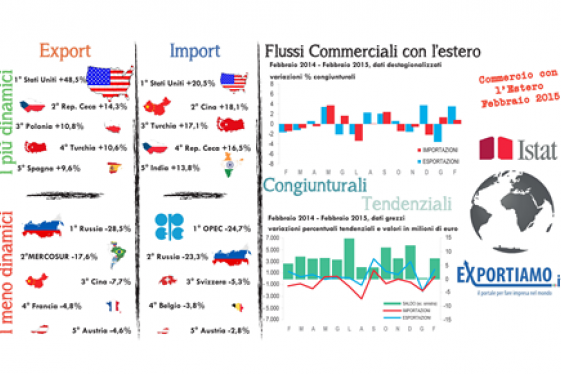 WTI Magazine #58 2015 April, 17Author : Exportiamo.it Translation by: ISTAT data on Foreign Trade in February 2015, give a photo of a cyclical increase in imports and exports with a trade surplus of 3.5 billion euro, increasing if compared to February 2014 (2.4 billion euro). Italian exports gave a positive performance (+ 2.5%) due to t...
