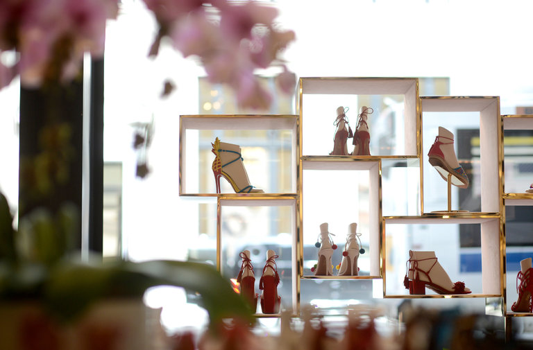 The new Aquazzura store on Madison Avenue sells shoes that complete perfect outfits: colorful high heels and slightly less high heels that lace up around the ankle, tied with tassel-ended bows that dance with a woman's stride.