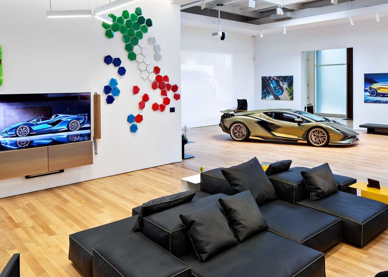 The gallery style lounge boasting more than 500 square meters of floor space on two floors contains a variety of private rooms for guests, who can enjoy them with an exclusive concierge at their service. An Ad Personam design study offers customers the opportunity to configure their Lamborghini vehicle with infinite color palettes and selections of materials. The meeting areas and the full-service kitchen are also available to host private meetings with a dedicated Italian chef.