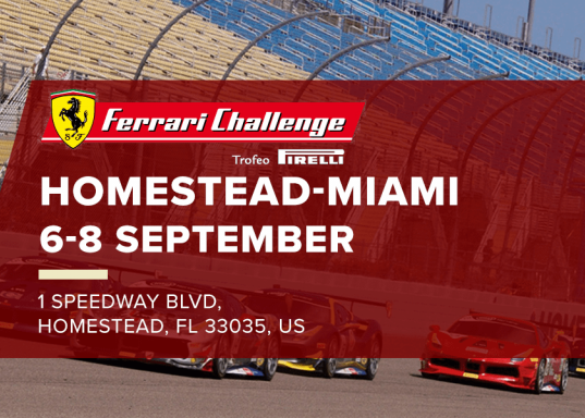 Friday September 06 to Sunday September 08. Homestead-Miami Speedway, 1 Speedway Blvd, Homestead, FL 33035. oin us for the final 2019 North American race before the Ferrari Challenge takes to Mugello for the 2019 Finali Mondiali. The 2019 Ferrari Challenge season returns to Homestead-Miami Speedway on September 7th and September 8th.