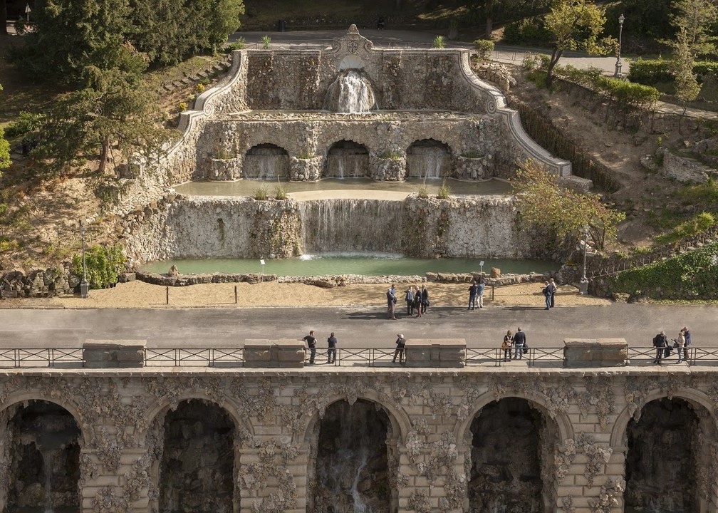 Set into a hillside above the Arno River in Florence, Le Rampe del Poggi (Poggi’s Ramps)—a four-tiered complex of manmade grottoes, basins, fountains, arches, walkways, and stairs—have long been a crumbling curiosity for Florentines and tourists making their way from the Tower of San Niccolò up to the Piazzale Michelangelo, one of Florence’s most popular panoramic lookouts. Like a fairy tale come true, the highly decorative romantic ruin, embellished with fantastical rock formations, ornamental stonework, and verdant flora, has been returned to its original glory, which didn’t last long in the first place.