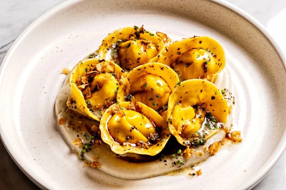 The dining room, all emerald green and brass, reads as clubby and chic—and, even with sponge-painted terra-cotta walls, entirely current. At the giant bar in the center of the restaurant, the crowd (there’s always a crowd) sips dirty martinis tinted with squid ink, sunset-hued Sicilian spritzes, and pitch-perfect Negronis. Aventino feels like what every owner dreams of: the place to be.