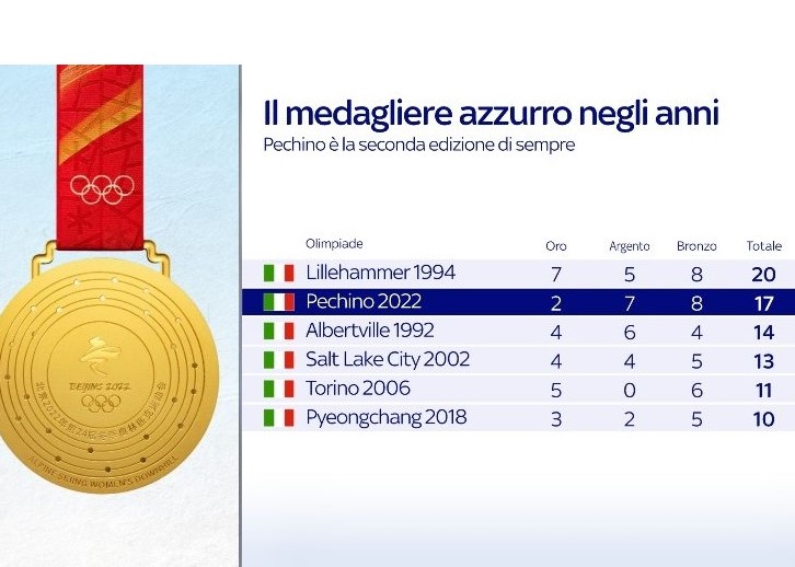 Therefore, 17 medals were won by the Azzurri in Beijing 2022, thus surpassing the quota of 10 reached in the previous Winter Olympics in PyeongChang 2018.