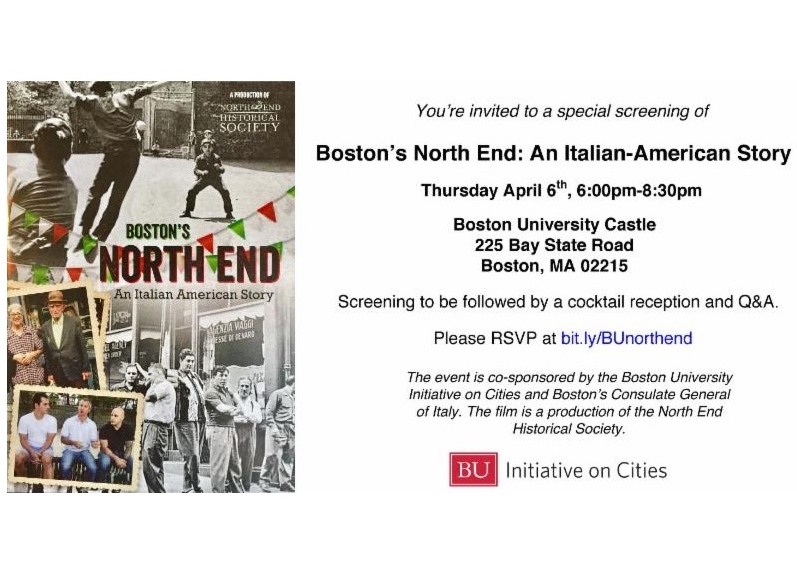 Thursday, April 6 | 6:00pm- 8:30pm | Boston University Castle | 225 Baty State Road, Boston: Boston's North End: An Italian-American Story. Produced by the North End Historical Society, Boston's North End: An Italian-American Story chronicles the vibrant community that has called the North End of Boston home for over 100 years.